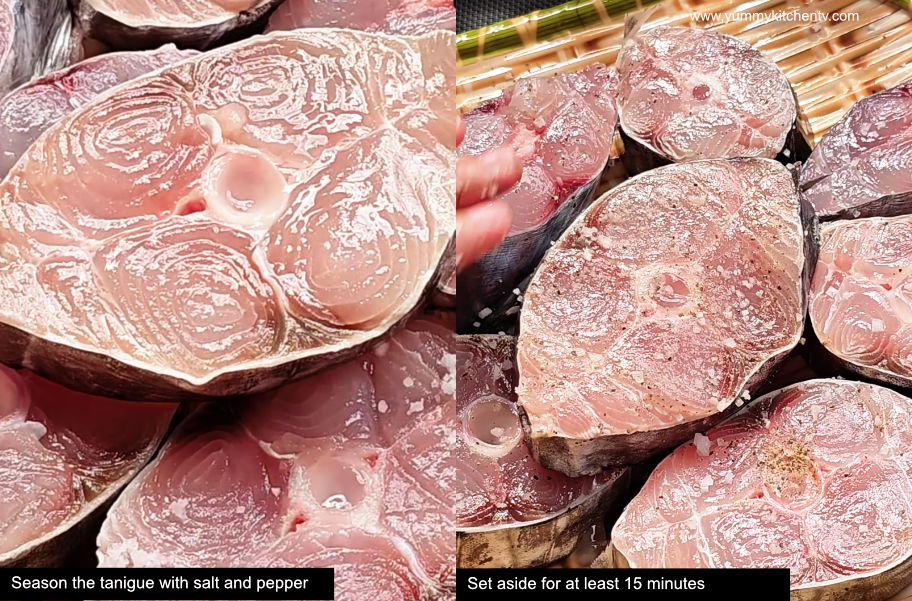 - Season the tanigue with salt and pepper. Set aside for at least 15 minutes.
