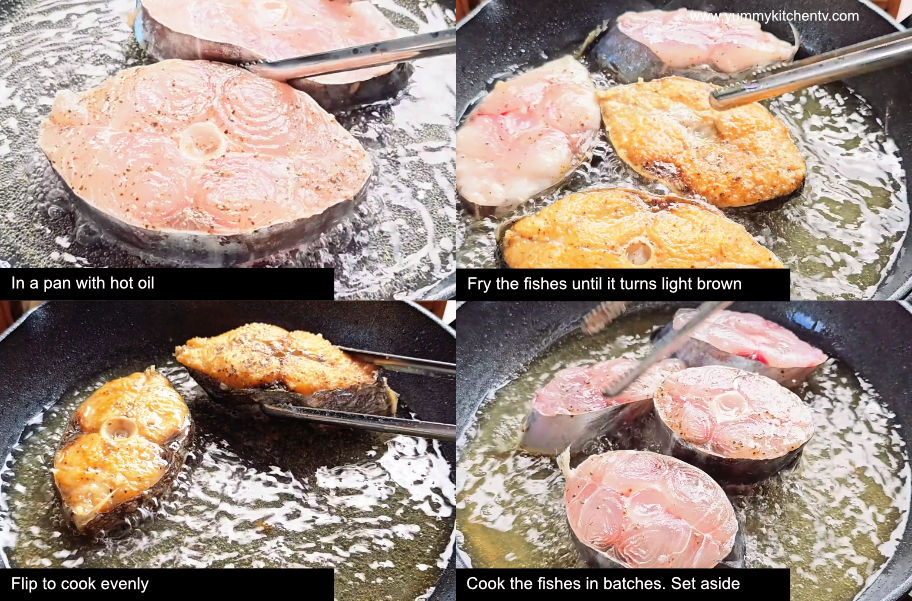 - In a pan with hot oil. Fry the fishes until it turns light brown. Flip to cook evenly. Cook the fishes in batches. Then set aside.