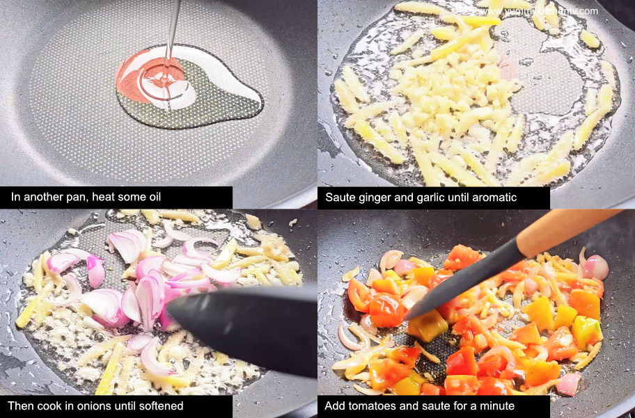 3. In another pan, heat some oil. Saute ginger and garlic until aromatic. Then cook in onions until softened. Add tomatoes and saute for a minute.