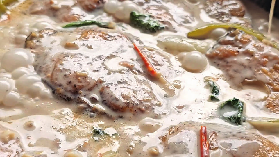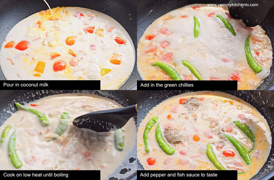 - Pour in coconut milk and add in the green chillies. Cook on low heat until boiling. Add pepper and fish sauce to taste.
