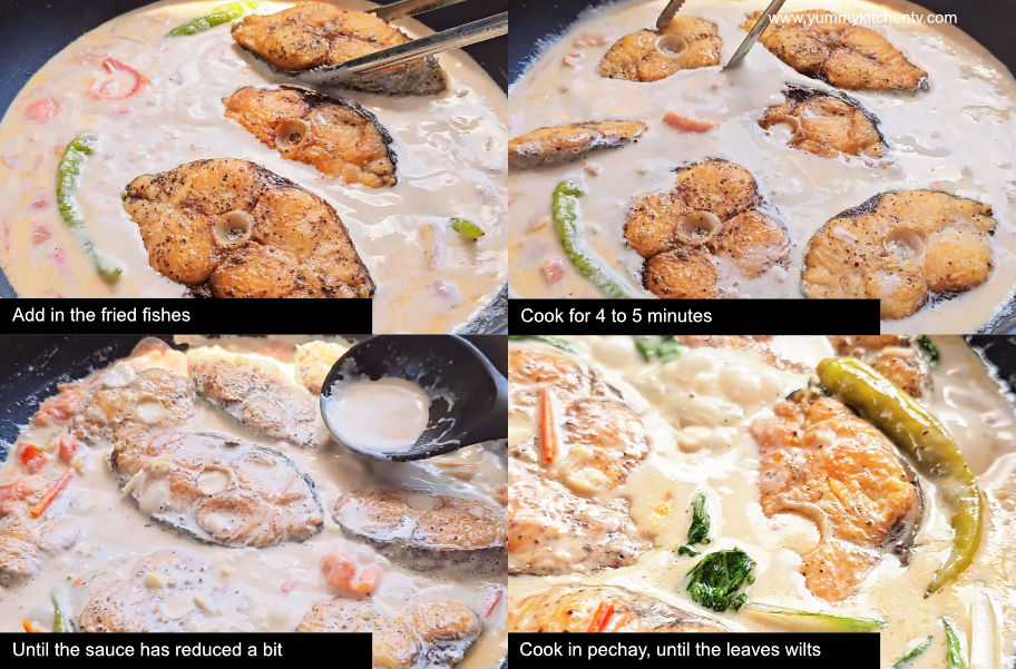 - Add in the fried fishes. Cook for 4 to 5 minutes or until the sauce has reduced a bit. Place in the pechay, cook just until the leaves have wilted.
