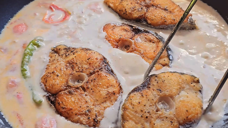 - Add back the fish, pour in the coconut milk, and place in green and red chillies. Cover and let this simmer together for 3 – 4 minutes.