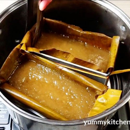 5. Cover the loaf pan with banana leaf. Place the cover of the steamer and steam it for 40 minutes. After steaming, remove the tikoy from the steamer and let it cool.