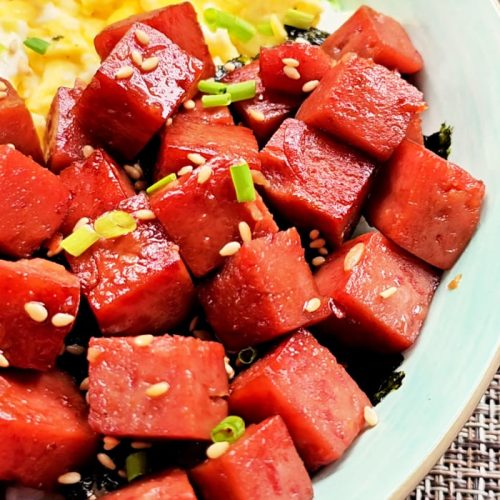 Spam Musubi Bowls also called “spam and rice bowl” or “spam musubi rice bowl” is a delicious Hawaiian dish that combines sweet and savory flavors in each irresistible bite. Spam glazed with a simple teriyaki sauce, place under freshly cooked rice, with a side of nori and eggs. It’s easy to make, very filling, and great anytime of the day.