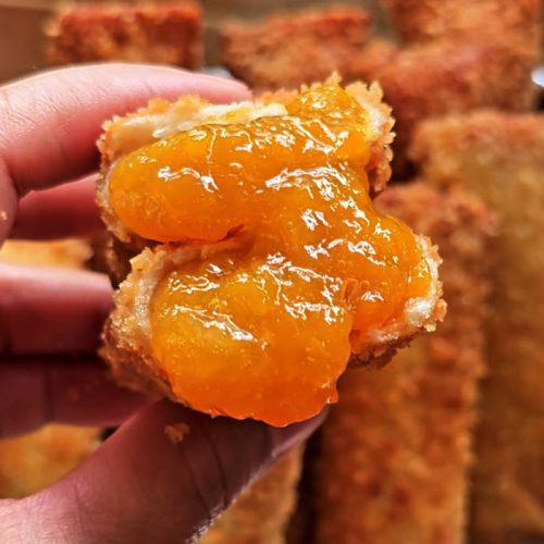 5. Coat this in a bowl with beaten eggs. Then toss this in breadcrumbs. Make sure every part is covered. Fry in a pan at medium heat with hot oil until golden brown.