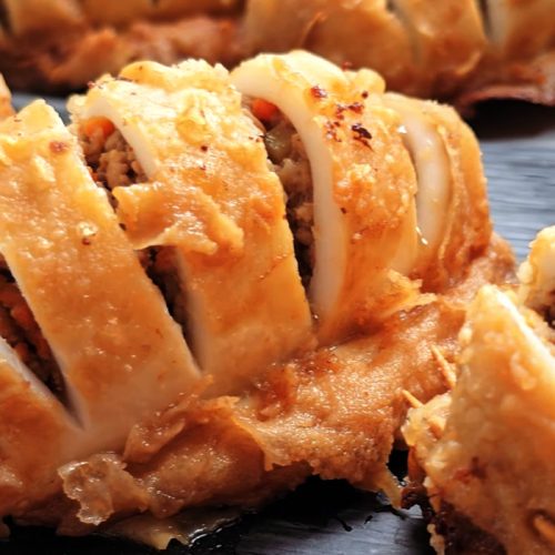 Rellenong Pusit is a bold classic Filipino dish that’s made of tender cooked squid stuffed with a savory mix of meat, vegetables, aromatics, and spices then fried to golden crispy perfection. It’s a perfect balance of savory, and slightly sweet and salty. an impressive yet easy dish that reminds you of the taste of home.