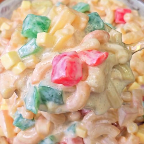For a vegetarian fruit macaroni salad recipe follow the ingredients and steps as is. But if you are looking for a ‘vegan’ version make sure to use vegan all purpose cream, vegan cheese, vegan mayonnaise, and vegan condensed milk.