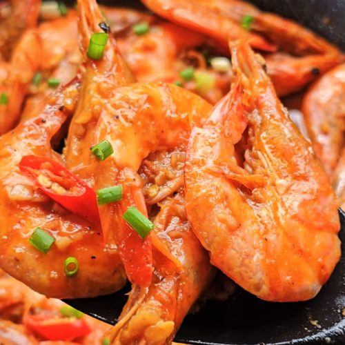 • Cook until the sauce has reduced slightly or has thickened. Add back the shrimps and toss until well coated with the sauce. Garnish with spring onions before serving.