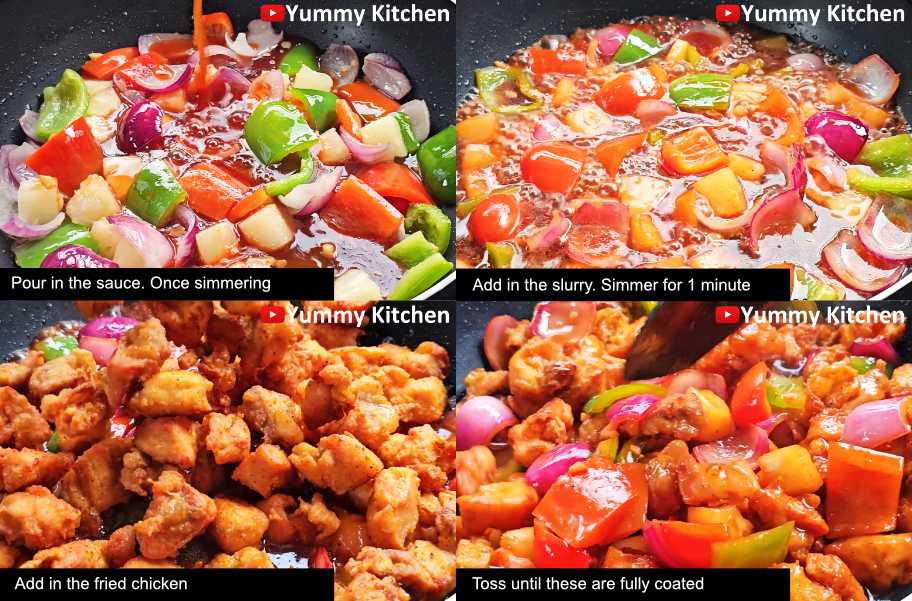 - Ibuhos dito ang sauce. Pakuluan bago haluan ng slurry. Pakuluin ng 1 minuto. Haluin ang fried chicken hanggang matakpan ang mga ito ng sarsa.